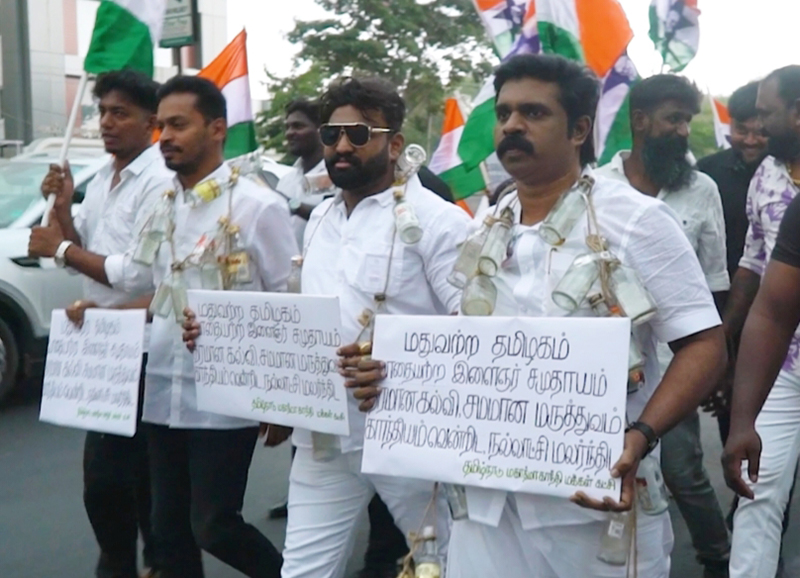 பீர் பாட்டில் மாலை அணிந்து, நடிகரும், மகாத்மா காந்தி மக்கள் கட்சி தலைவருமான தக்ஷன் விஜய், தனது கட்சி வேட்பாளருக்கு மனுதாக்கல் செய்தார்!